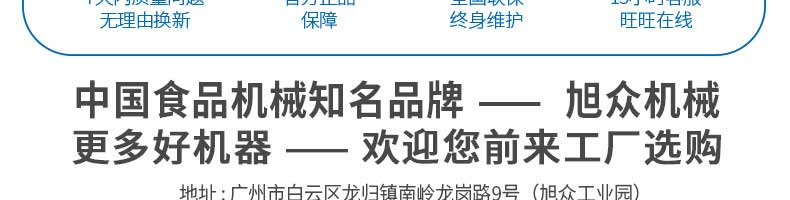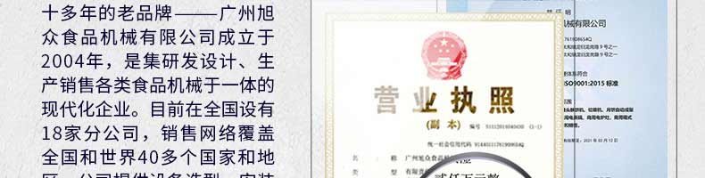 廣州旭眾食品機(jī)械有限公司是一家集科研開發(fā),生產(chǎn)設(shè)計(jì),營(yíng)銷服務(wù)為一體的現(xiàn)代化生產(chǎn)企業(yè)?,F(xiàn)代化生產(chǎn)車間,精湛制造技術(shù),所產(chǎn)機(jī)械歷經(jīng)市場(chǎng)重重考驗(yàn),不斷贏得海內(nèi)外客戶的贊譽(yù)。