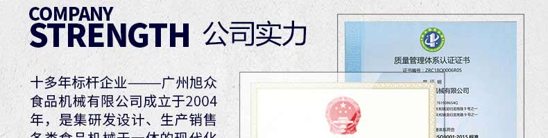 廣州旭眾食品機(jī)械有限公司是一家集科研開發(fā),生產(chǎn)設(shè)計(jì),營銷服務(wù)為一體的現(xiàn)代化生產(chǎn)企業(yè)。現(xiàn)代化生產(chǎn)車間,精湛制造技術(shù),所產(chǎn)機(jī)械歷經(jīng)市場重重考驗(yàn),不斷贏得海內(nèi)外客戶的贊譽(yù)。