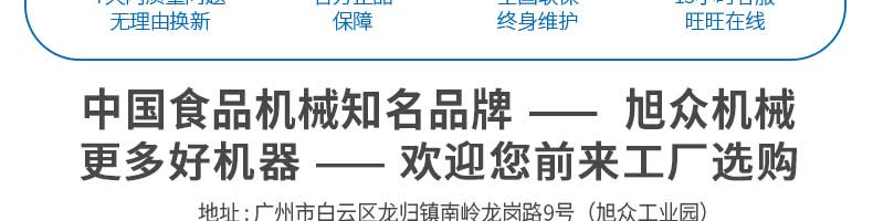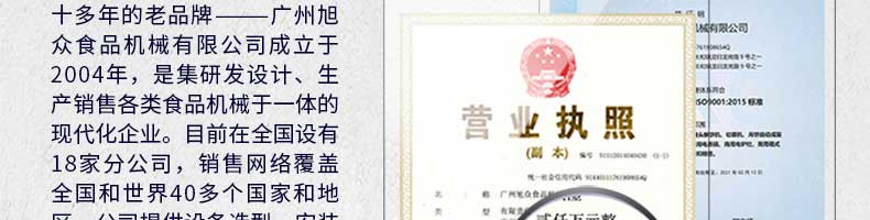廣州旭眾食品機(jī)械有限公司是一家集科研開發(fā),生產(chǎn)設(shè)計,營銷服務(wù)為一體的現(xiàn)代化生產(chǎn)企業(yè)。現(xiàn)代化生產(chǎn)車間,精湛制造技術(shù),所產(chǎn)機(jī)械歷經(jīng)市場重重考驗,不斷贏得海內(nèi)外客戶的贊譽。