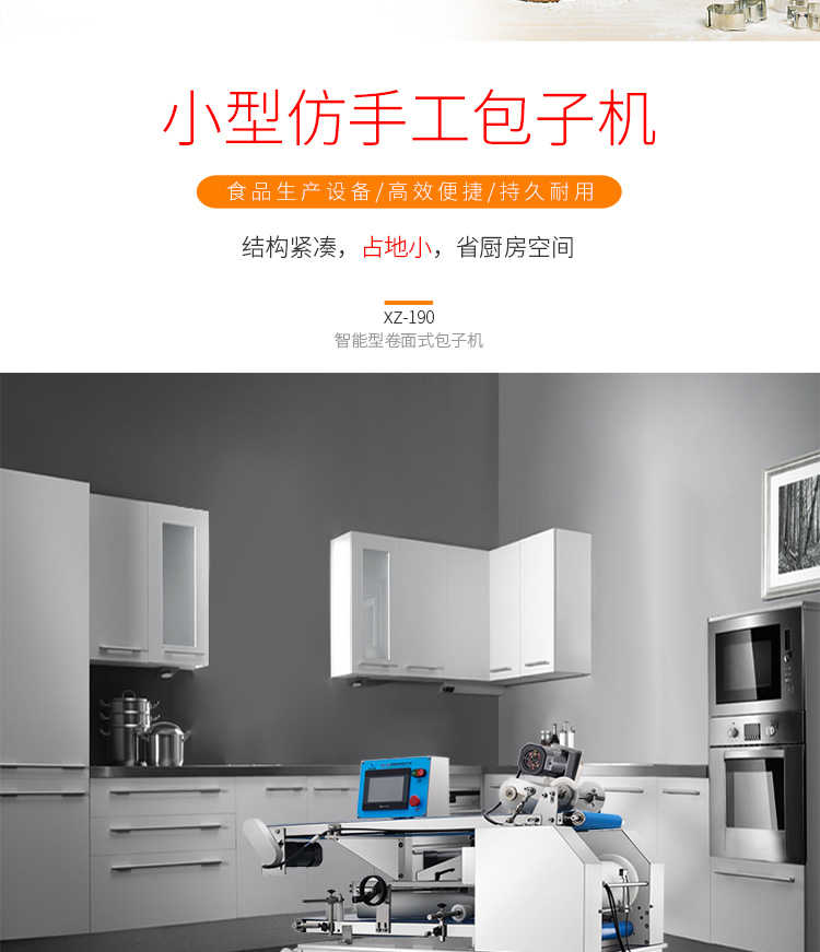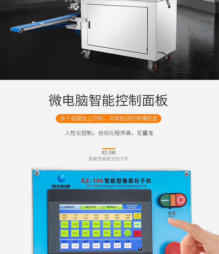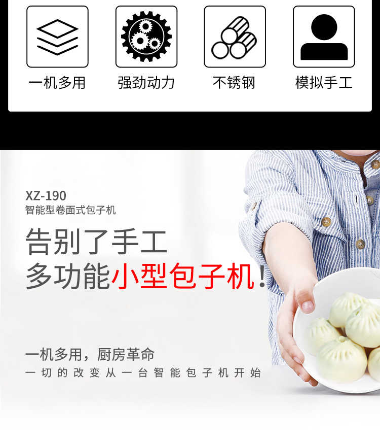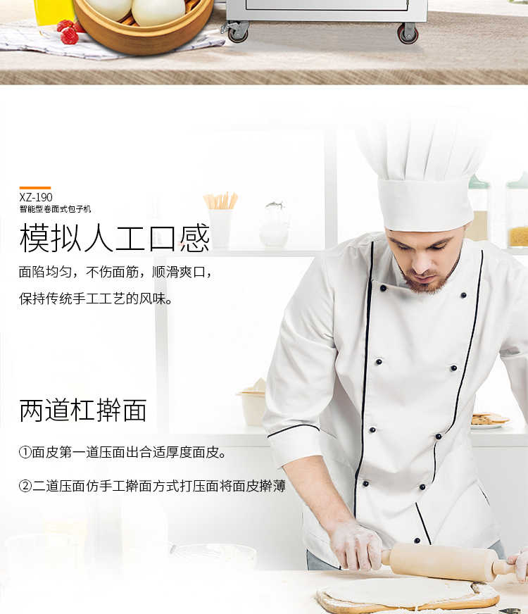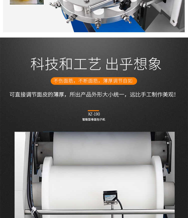 XZ-190智能型卷面式包子機(jī),科技和工藝出乎想象不傷面筋,不斷面筋,薄厚調(diào)節(jié)自如可直接調(diào)節(jié)面皮的薄厚,所出產(chǎn)品外形大小統(tǒng)一,遠(yuǎn)比手工制作美觀!