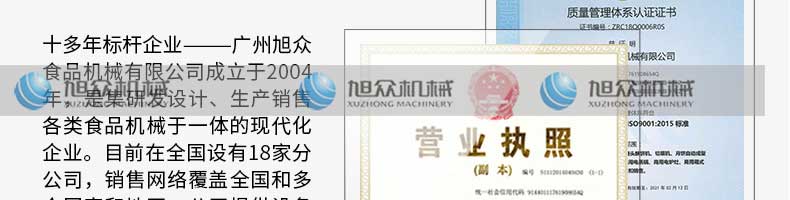 廣州旭眾食品機(jī)械有限公司是一家集科研開發(fā),生產(chǎn)設(shè)計(jì),營銷服務(wù)為一體的現(xiàn)代化生產(chǎn)企業(yè)。現(xiàn)代化生產(chǎn)車間,精湛制造技術(shù),所產(chǎn)機(jī)械歷經(jīng)市場重重考驗(yàn),不斷贏得海內(nèi)外客戶的贊譽(yù)。