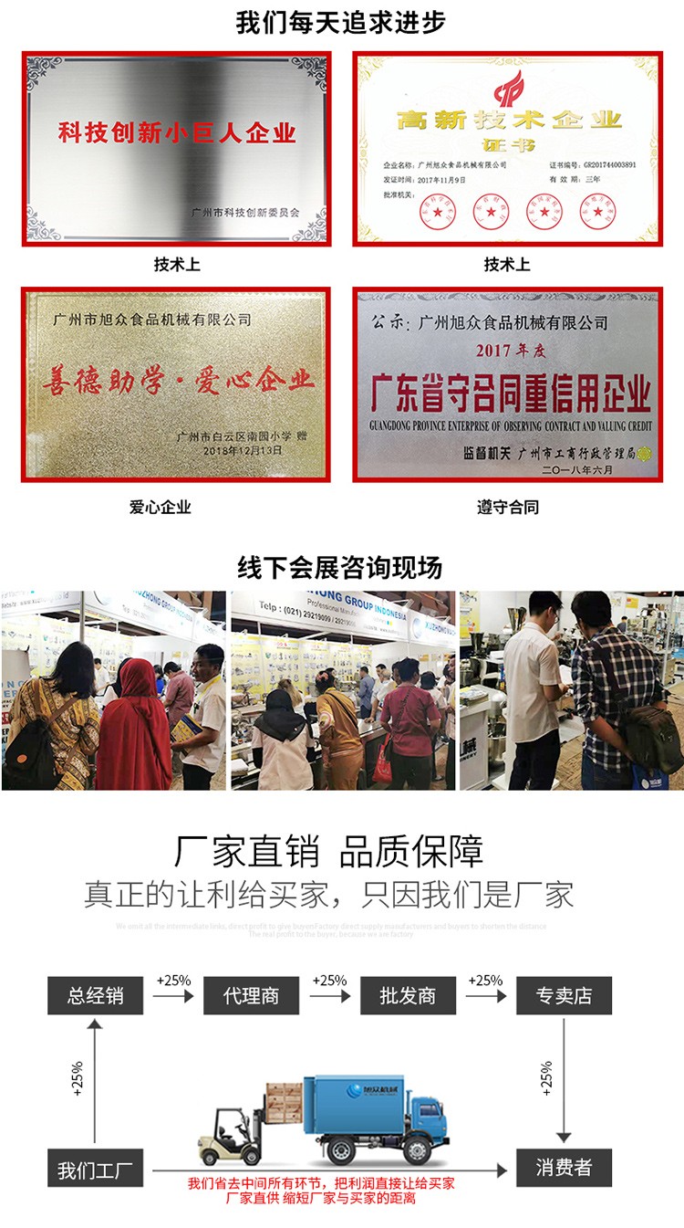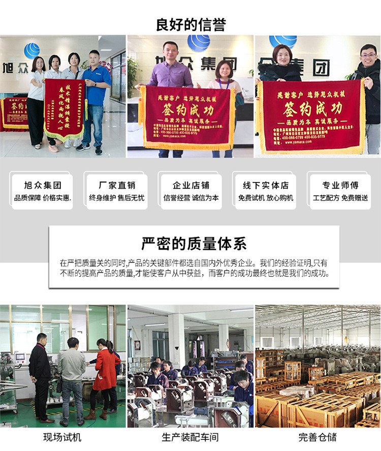 廣州旭眾食品機(jī)械有限公司是一家集科研開發(fā),生產(chǎn)設(shè)計(jì),營銷服務(wù)為一體的現(xiàn)代化生產(chǎn)企業(yè)?,F(xiàn)代化生產(chǎn)車間,精湛制造技術(shù),所產(chǎn)機(jī)械歷經(jīng)市場(chǎng)重重考驗(yàn),不斷贏得海內(nèi)外客戶的贊譽(yù)。