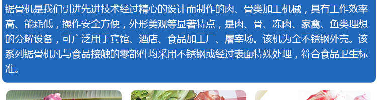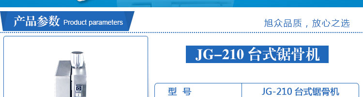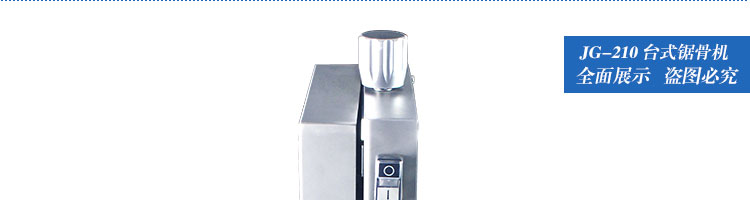 JG-210臺(tái)式鋸骨機(jī),適用于各類骨頭,冷凍肉,帶魚骨,冰塊,冷凍魚的分割。采用全不銹鋼材料制作,具有工作效率高,操作安全的特點(diǎn)。廣泛適用于食品加工廠,屠宰場,肉類加工廠等