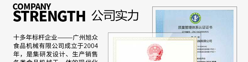 廣州旭眾食品機(jī)械有限公司是一家集科研開發(fā),生產(chǎn)設(shè)計(jì),營(yíng)銷服務(wù)為一體的現(xiàn)代化生產(chǎn)企業(yè)。現(xiàn)代化生產(chǎn)車間,精湛制造技術(shù),所產(chǎn)機(jī)械歷經(jīng)市場(chǎng)重重考驗(yàn),不斷贏得海內(nèi)外客戶的贊譽(yù)。