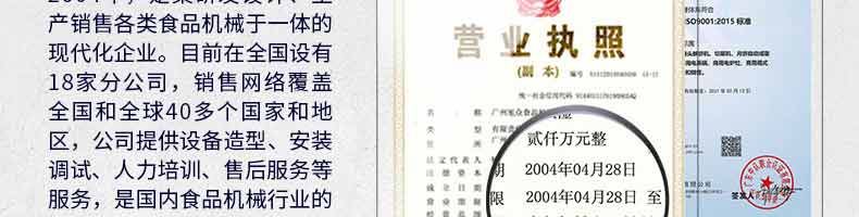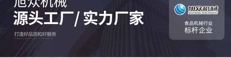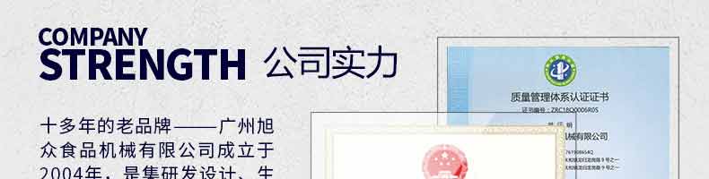 廣州旭眾食品機(jī)械有限公司是一家集科研開發(fā),生產(chǎn)設(shè)計,營銷服務(wù)為一體的現(xiàn)代化生產(chǎn)企業(yè)?,F(xiàn)代化生產(chǎn)車間,精湛制造技術(shù),所產(chǎn)機(jī)械歷經(jīng)市場重重考驗,不斷贏得海內(nèi)外客戶的贊譽(yù)。