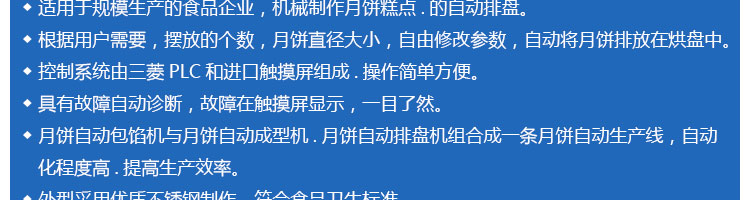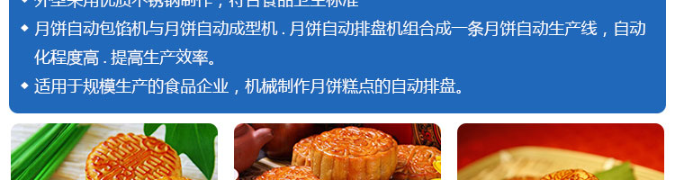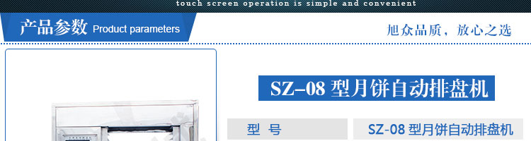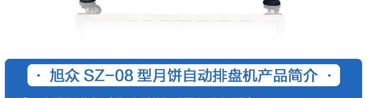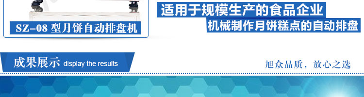 SZ-08型月餅自動(dòng)排盤(pán)機(jī),可同于制作各種月餅。適用于蛋糕房、休閑食品廠、食品加工產(chǎn)、面包房、月餅加工廠、超市、學(xué)校、食堂等各種工作場(chǎng)所??蓾M(mǎn)足不同客戶(hù)群體。免費(fèi)提供工藝技術(shù)。
